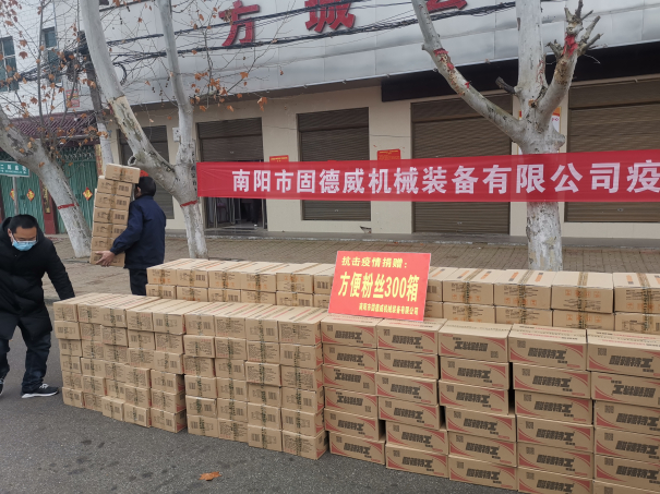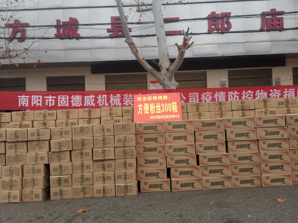 近期,新型冠狀病毒引發(fā)的肺炎疫情牽動著全國人民的心,2020年2月13日,一輛裝滿方便粉絲的卡車駛進南陽市方城縣二郎廟鎮(zhèn)政府,方便粉絲是由南陽市固德威機械裝備有限公司捐贈,共300箱。